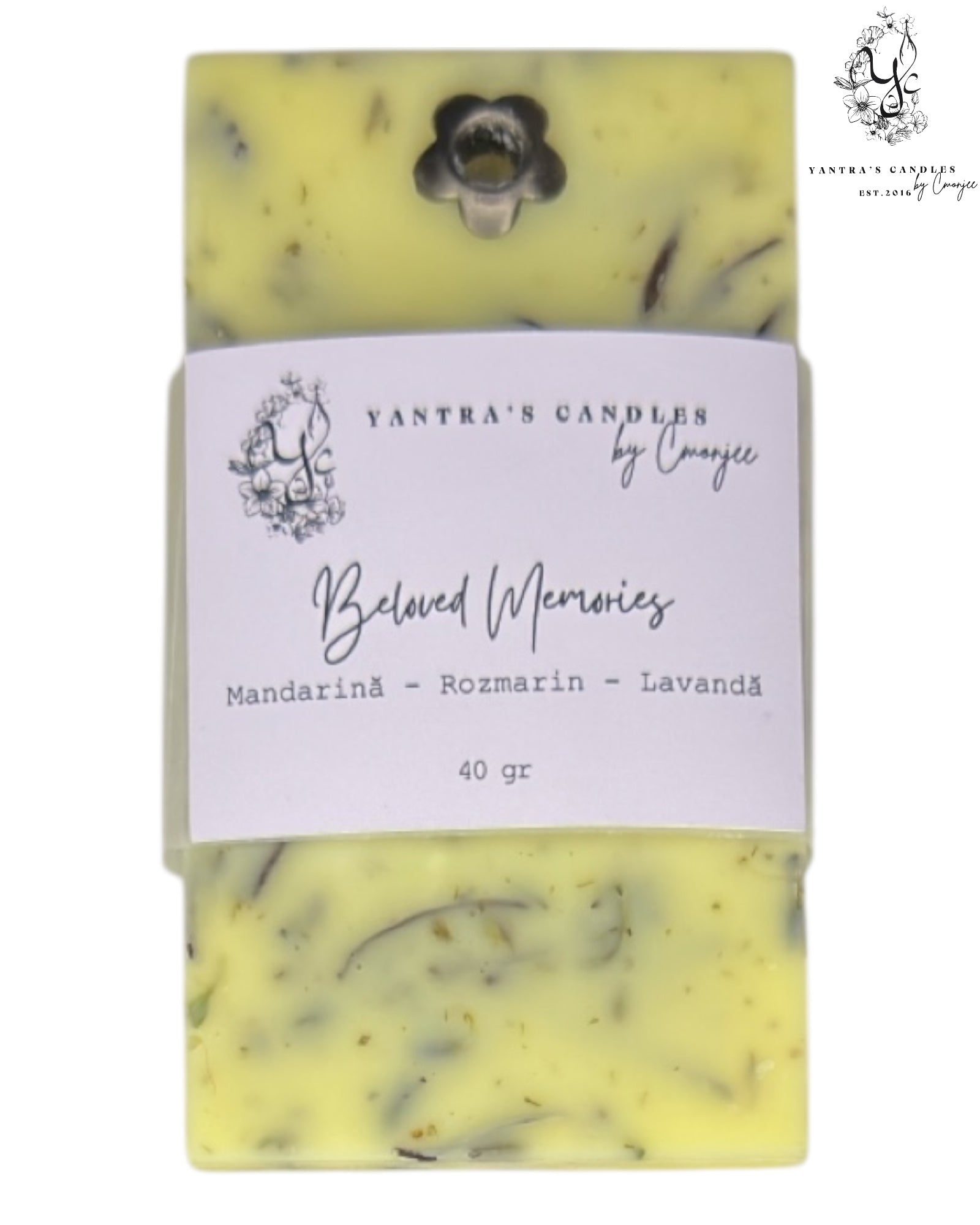 Ingrediente: ceară de soia, uleiuri esențiale naturale din mandarină- citrus nobilis, rozmarin-rosmarinus officinalis, lavandă - lavandula officinalis, flori de lavandă, rozmarin
